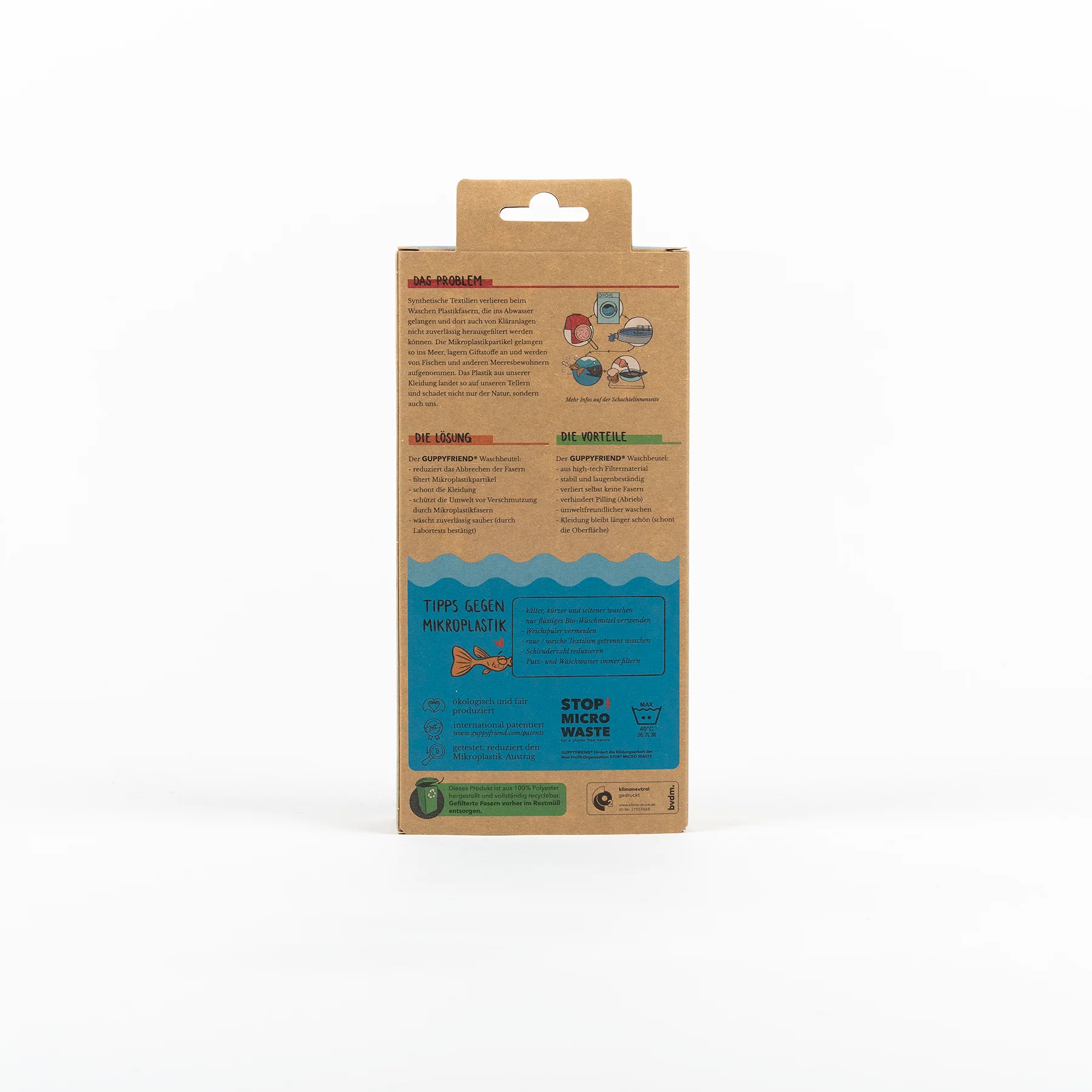 A Guppyfriend mosózacskó az első gyakorlatias megoldás, amely megakadályozza, hogy a mikroplasztik szálak a mosás során a folyókba és a tengerekbe kerüljenek. A szakadt szálak a mosás után a mosózacskó sarkaiban rakódnak le, és könnyen eltávolíthatók és megsemmisíthetők.