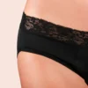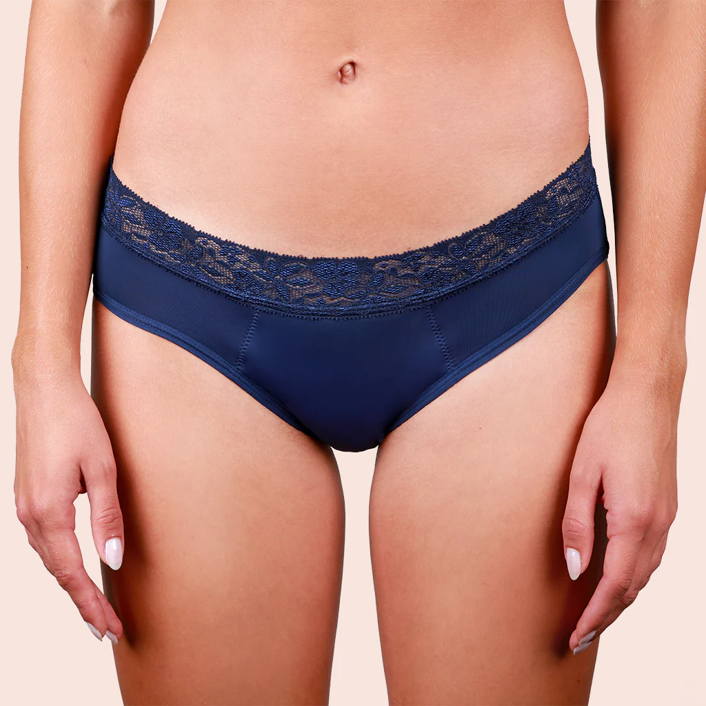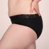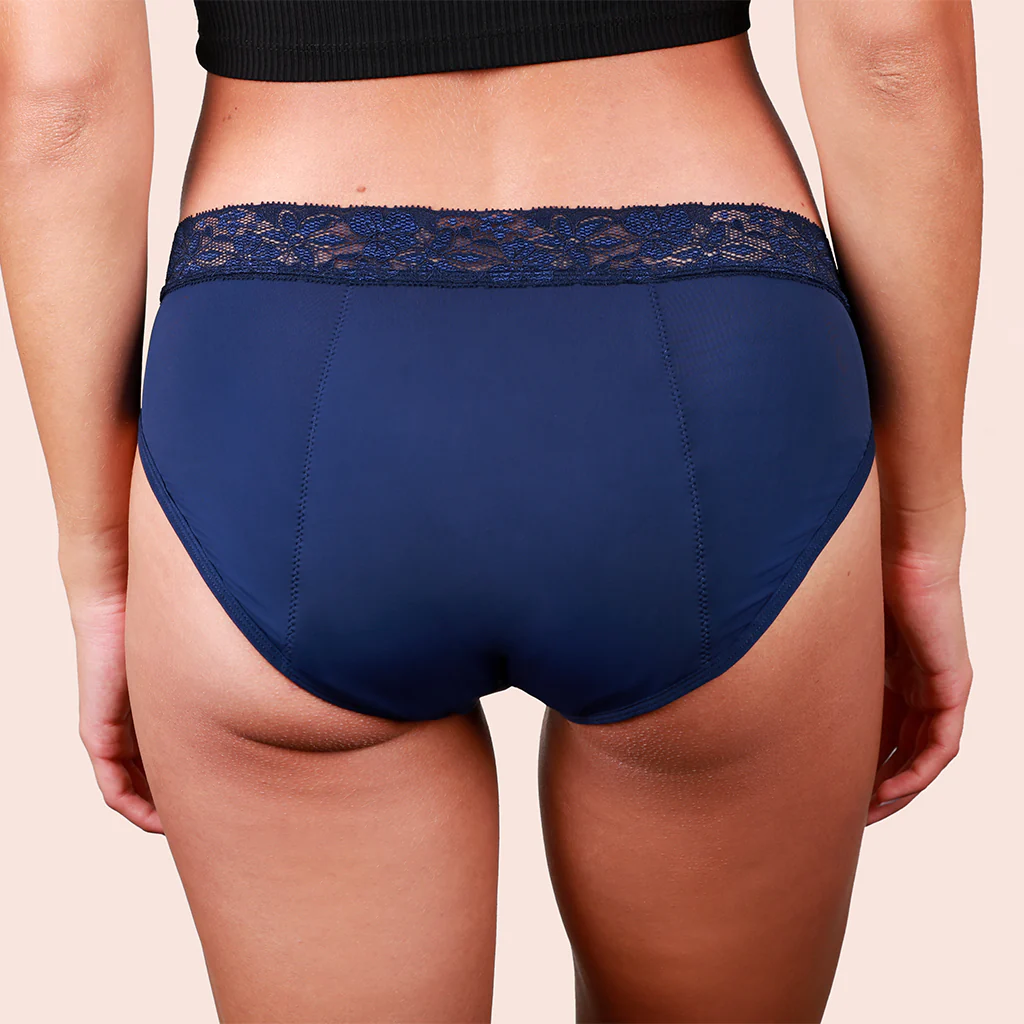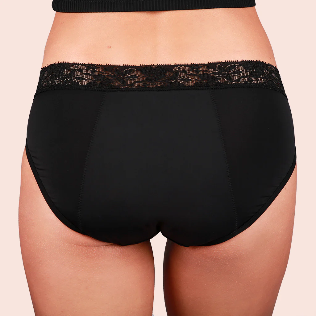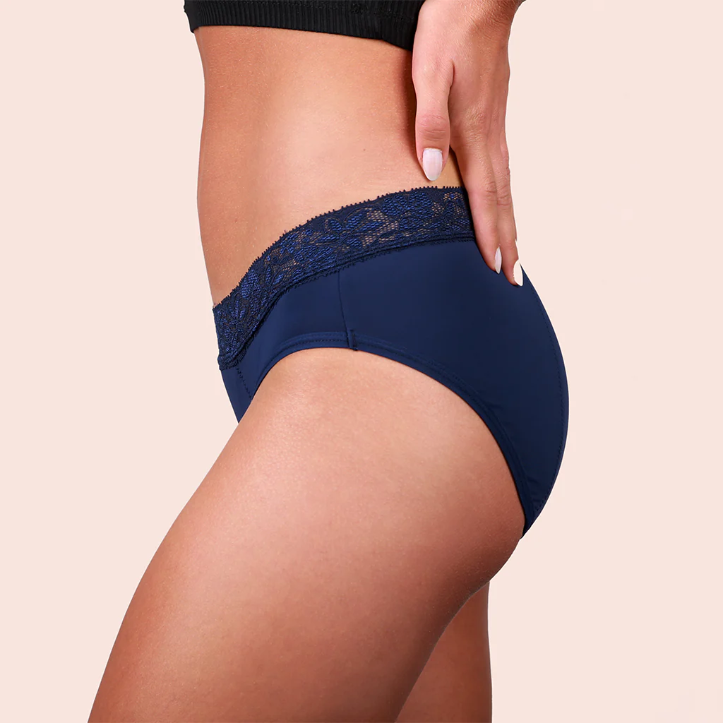 A Queen modellünk kissé alacsonyabban ül és közepesen erős ill. erős menstruációs időszakokban nyújt optimális védelmet. Csinos, virágmintás csipkével van díszítve, ami keskenyebb, mint a Taynie Deluxe csipkéje. A védelmi terület a derékvonalig terjed, így ideális  éjszakára is.